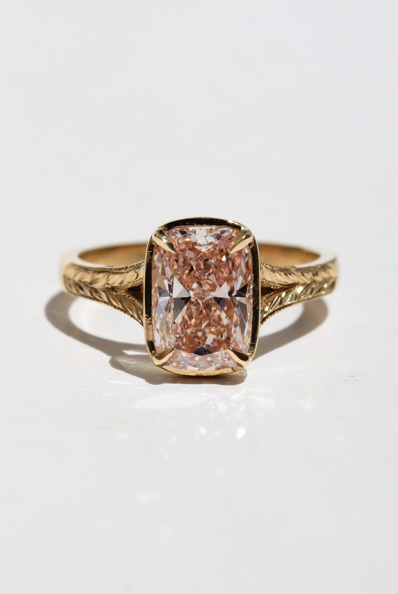 To elevate the centre stone, we designed a signature setting with a floating gold rail that the diamond sits upon, finished with classic cat claws for a graceful, light-catching silhouette. The band is thoughtfully detailed with a split shoulder, then brought to life by our skilled hand engraver, who added delicate engraving and a fine millgrain edge, creating texture, depth, and heirloom charm.